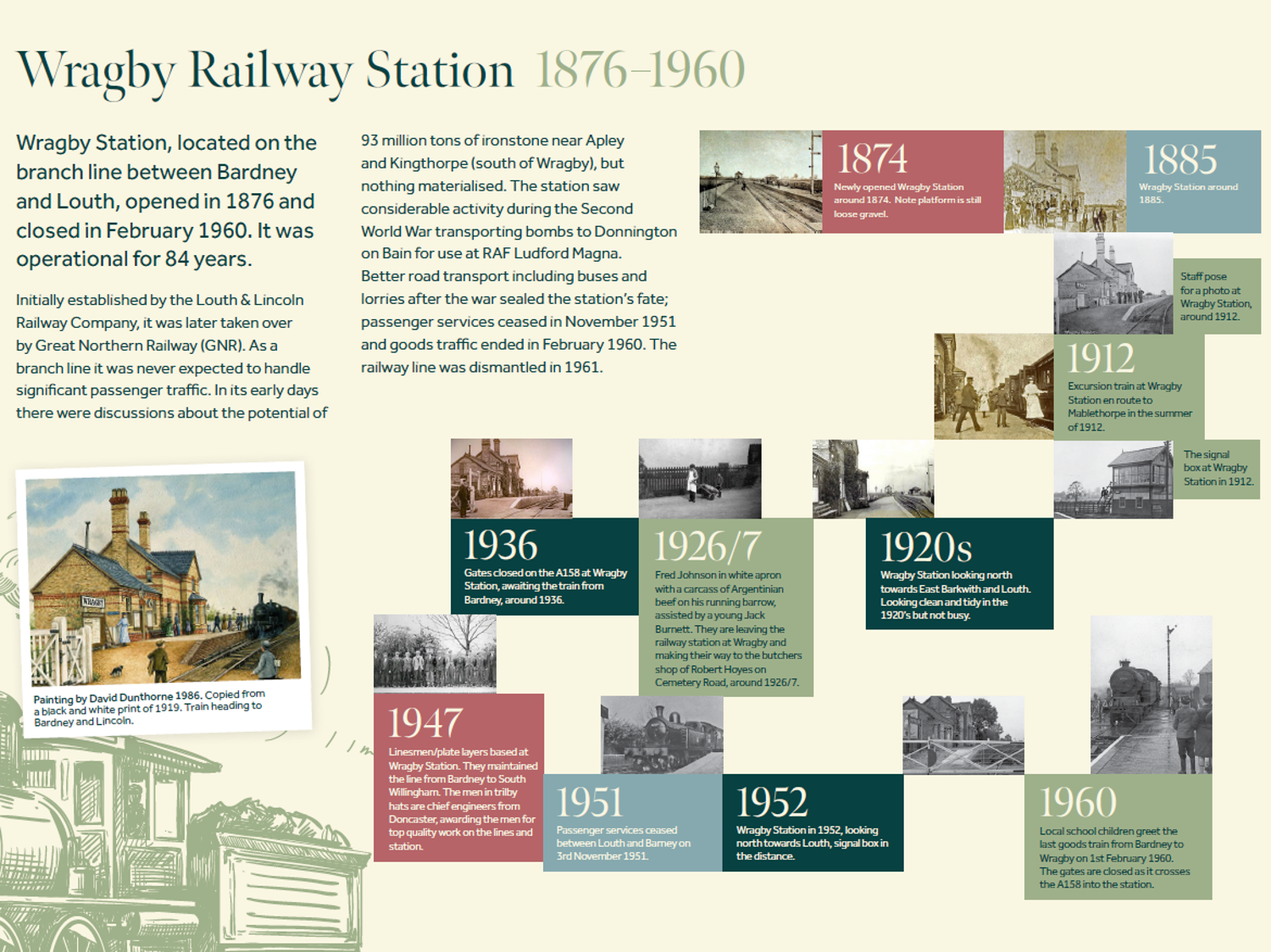 The content for the museum was curated, researched, and written by volunteers from the Wragby Heritage Group, a local history society. The museum occupied two floors of a formerly empty commercial property, turned into a coherent, multi-media experience by local fitters Allen Signs based on design work by Energy Cell. The museum was dedicated to the local heritage of Wragby with video content, artefact displays, interactive content, information boards, printed work, and a ground floor bathroom available for use.